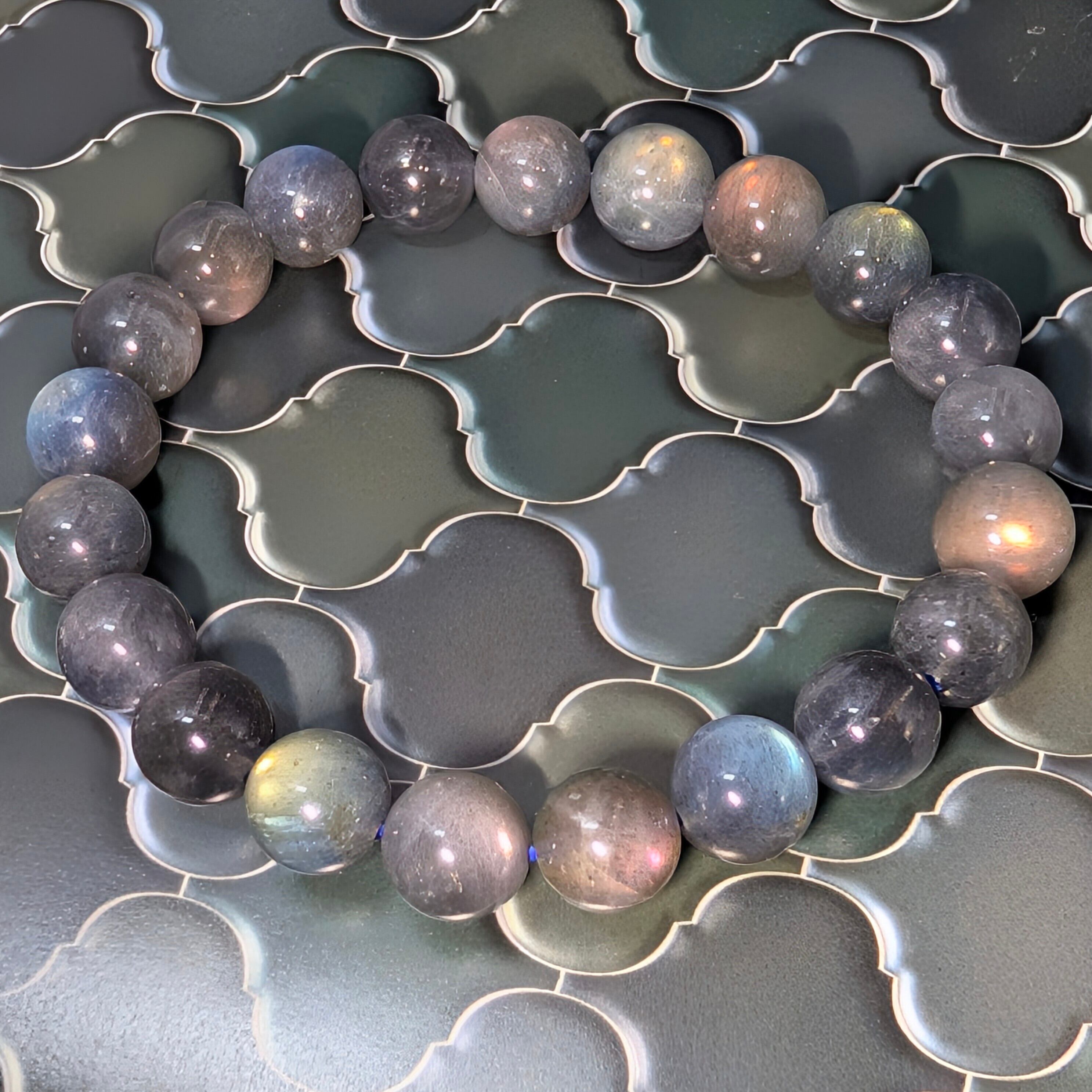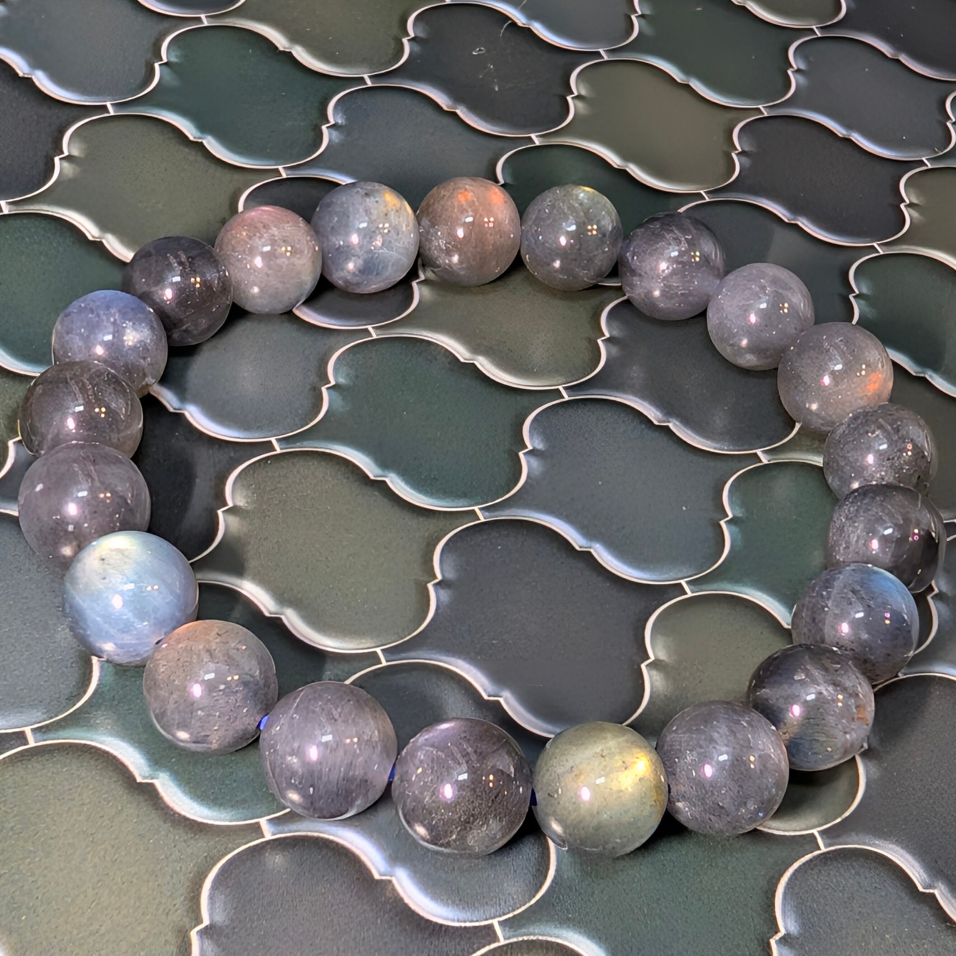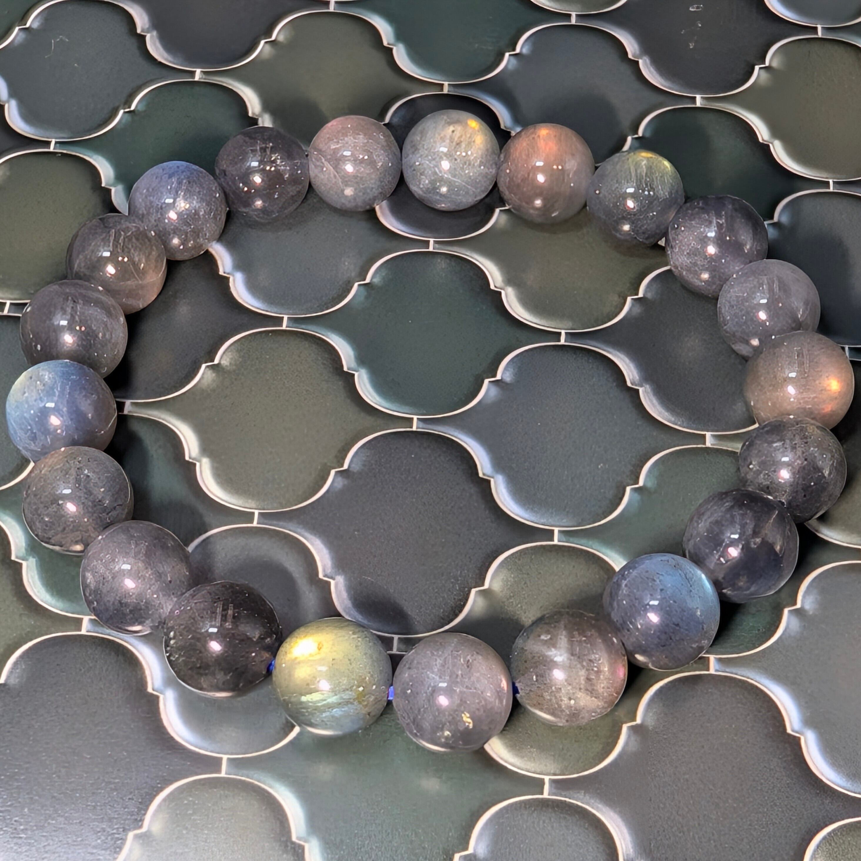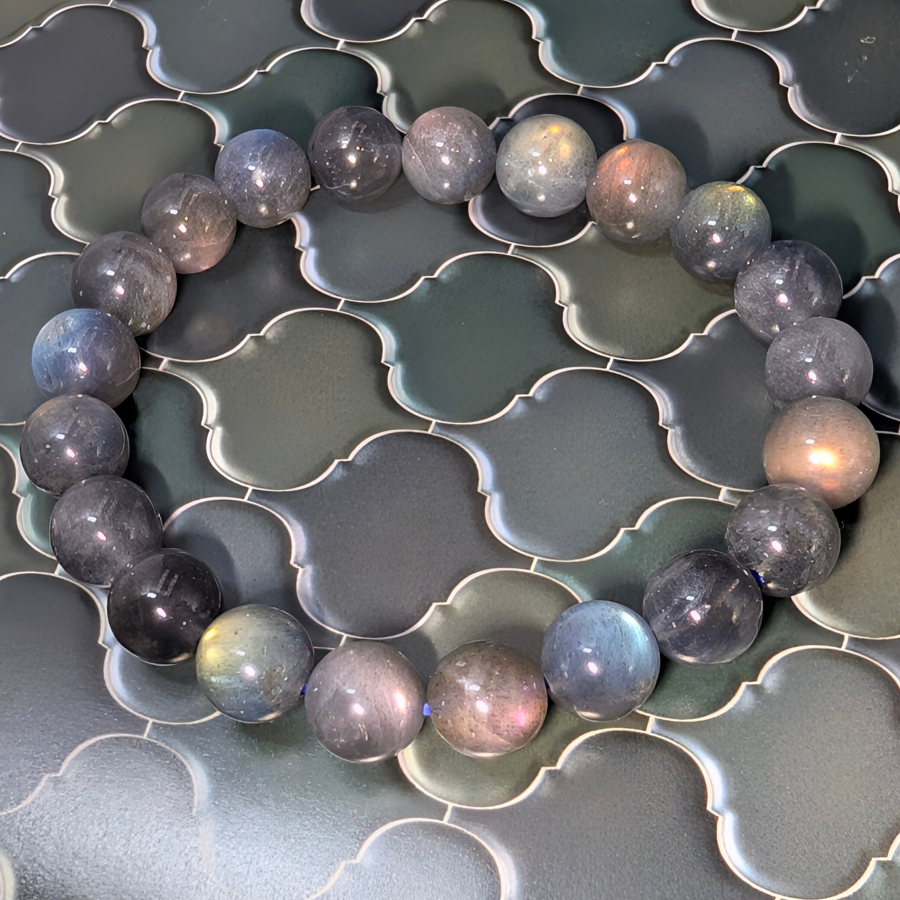 全珠に美しいラブラドレッセンス(遊色効果)を確認できる高品質ブレスレットです。透明感のある珠も含まれ、青や緑、金、オレンジ、時に紫を帯びた、幻のラブラドライトとも云われるピンクゴールドの閃光が角度によって幻想的に輝きます。