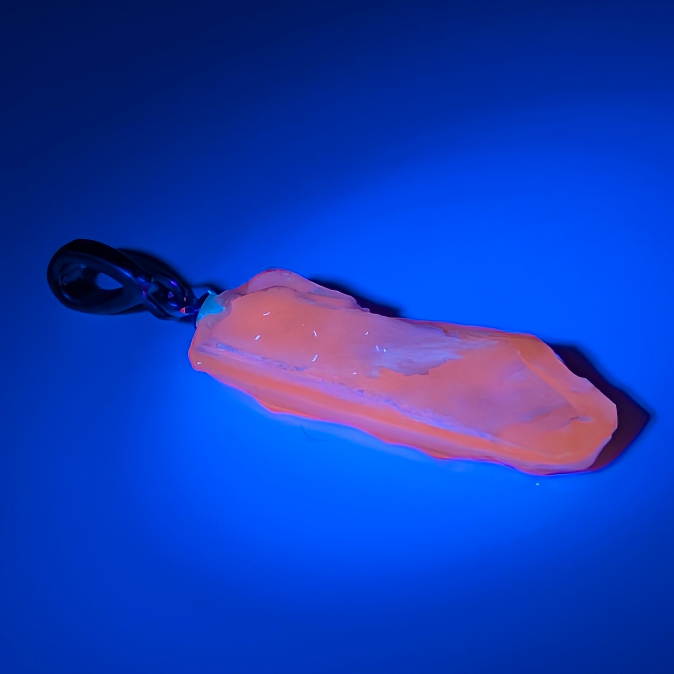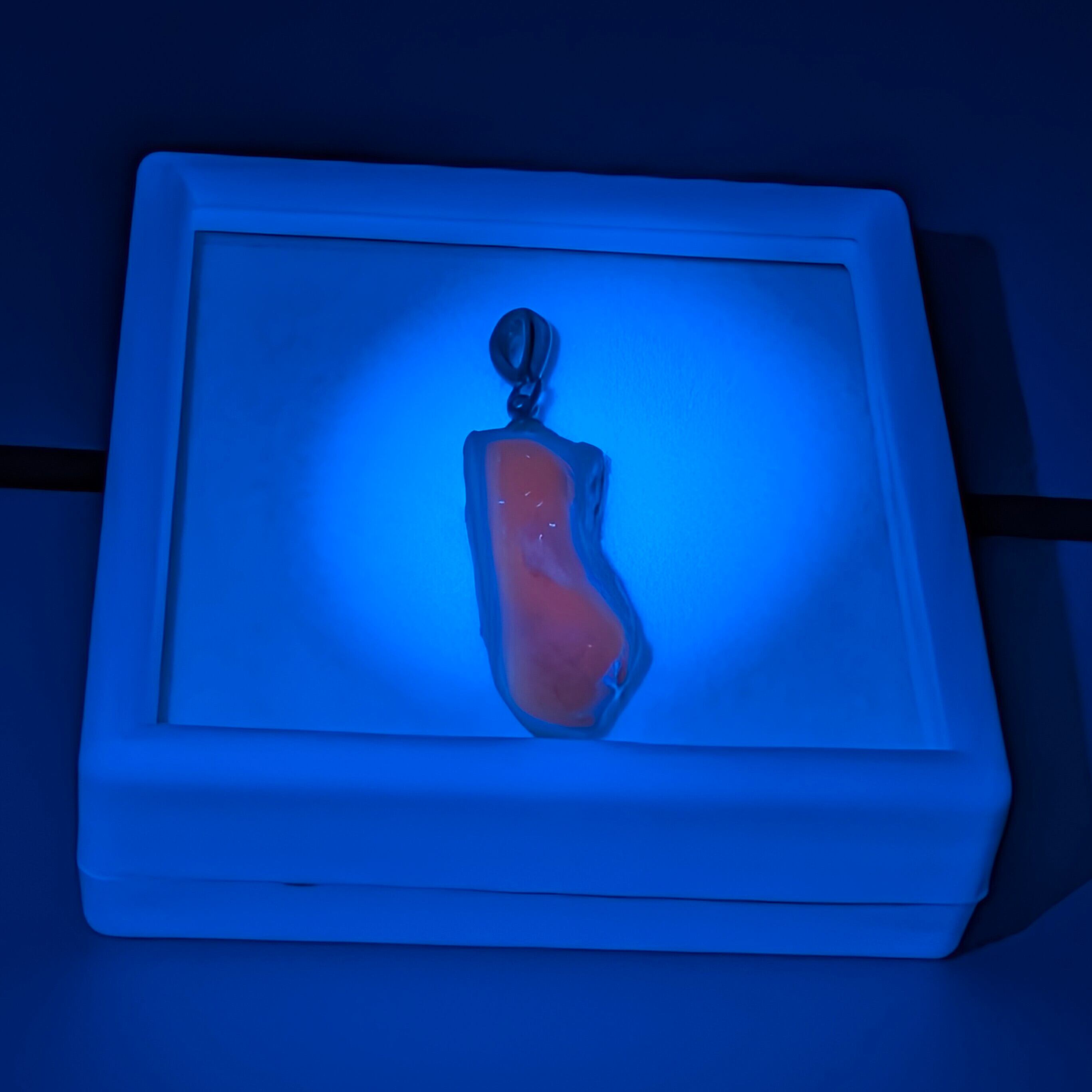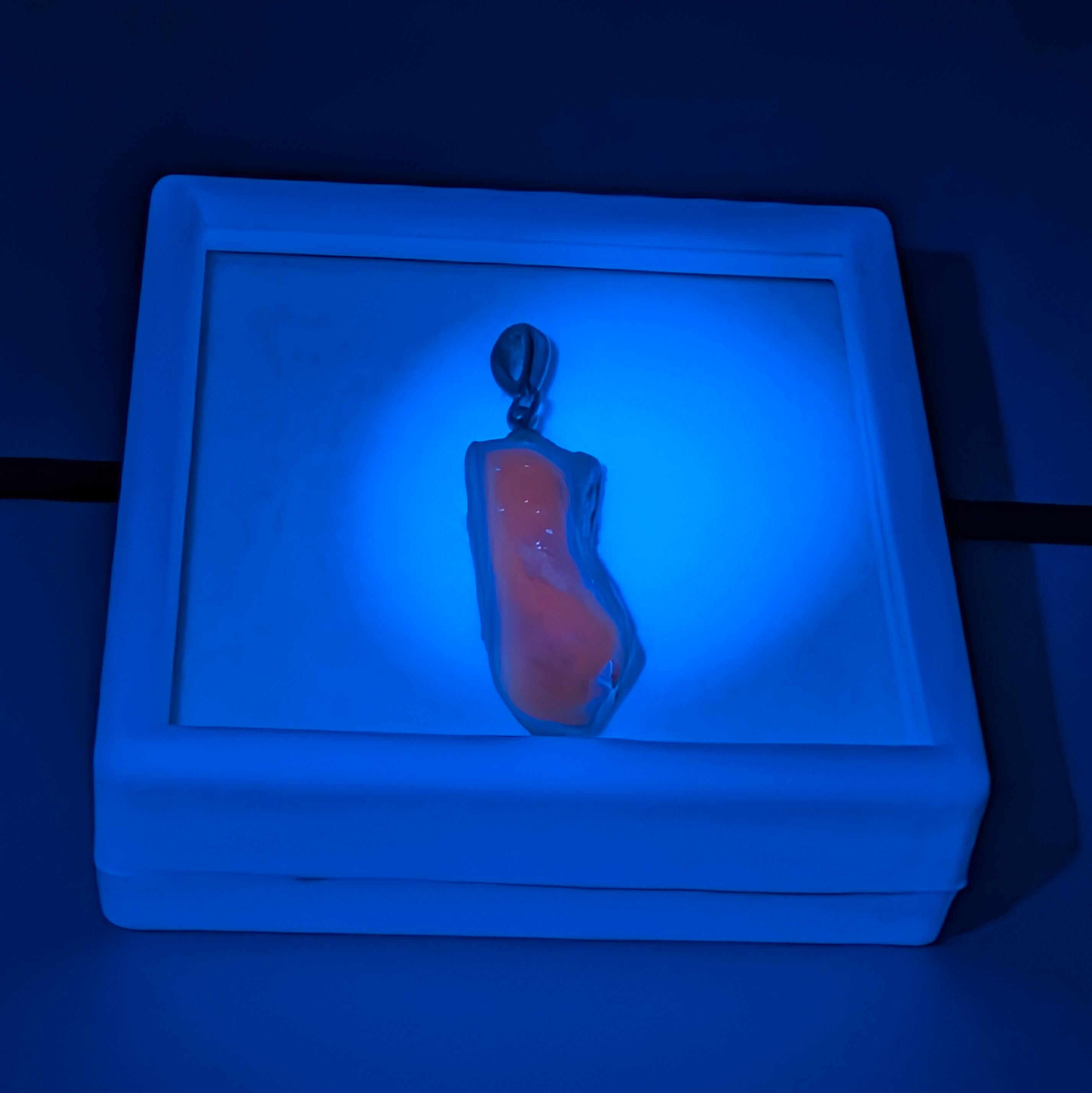 紫外線を当てると赤・緑・青・黄など多彩なネオンカラーを瞬時に放つ蛍光性を持ち、可視光では見えない色までも光として引き出す神秘の天然石