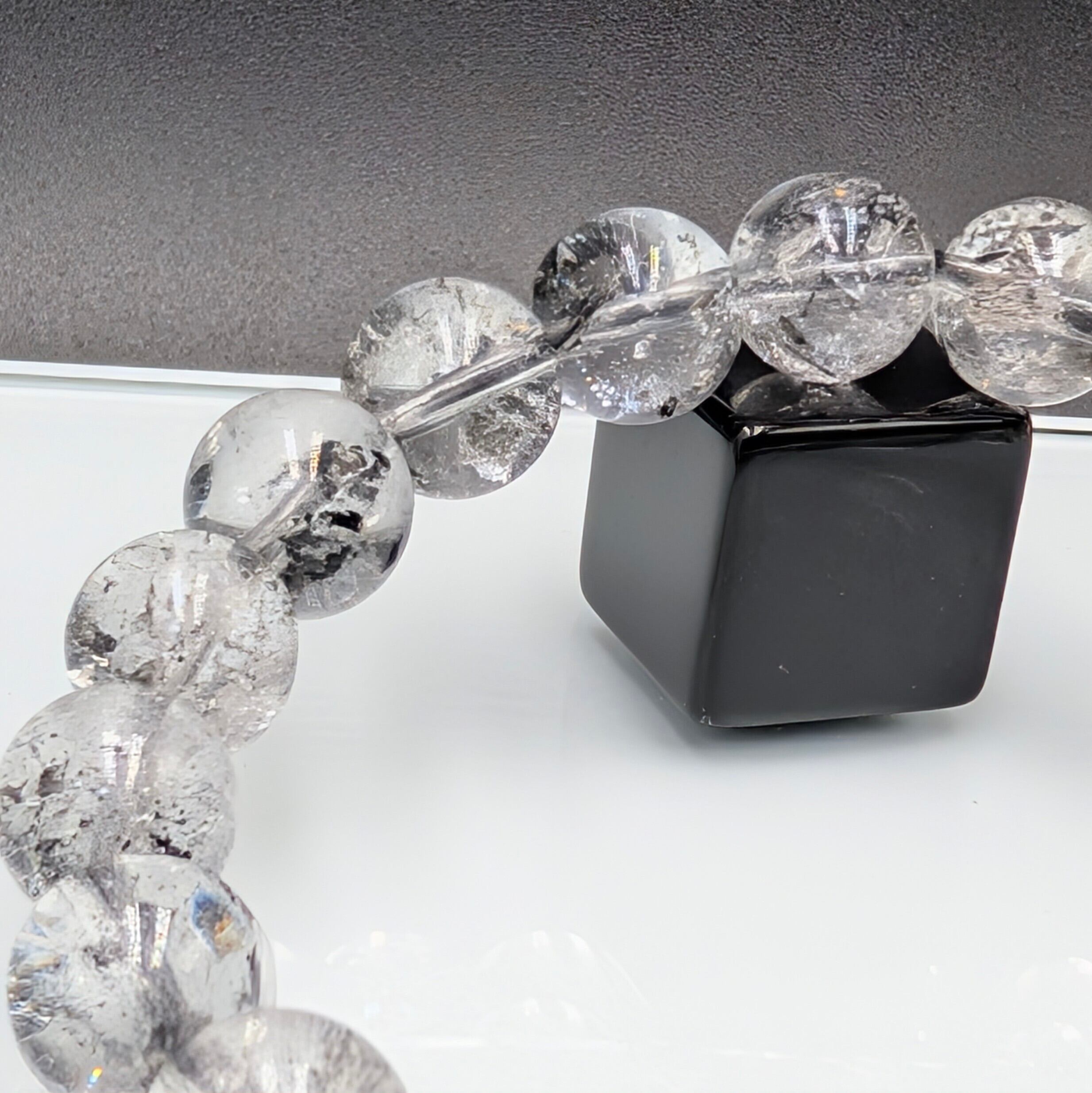 透明な水晶の中に浮かぶグラフェン(黒鉛)(トポロジカル物質)などのインクルージョンが印象的