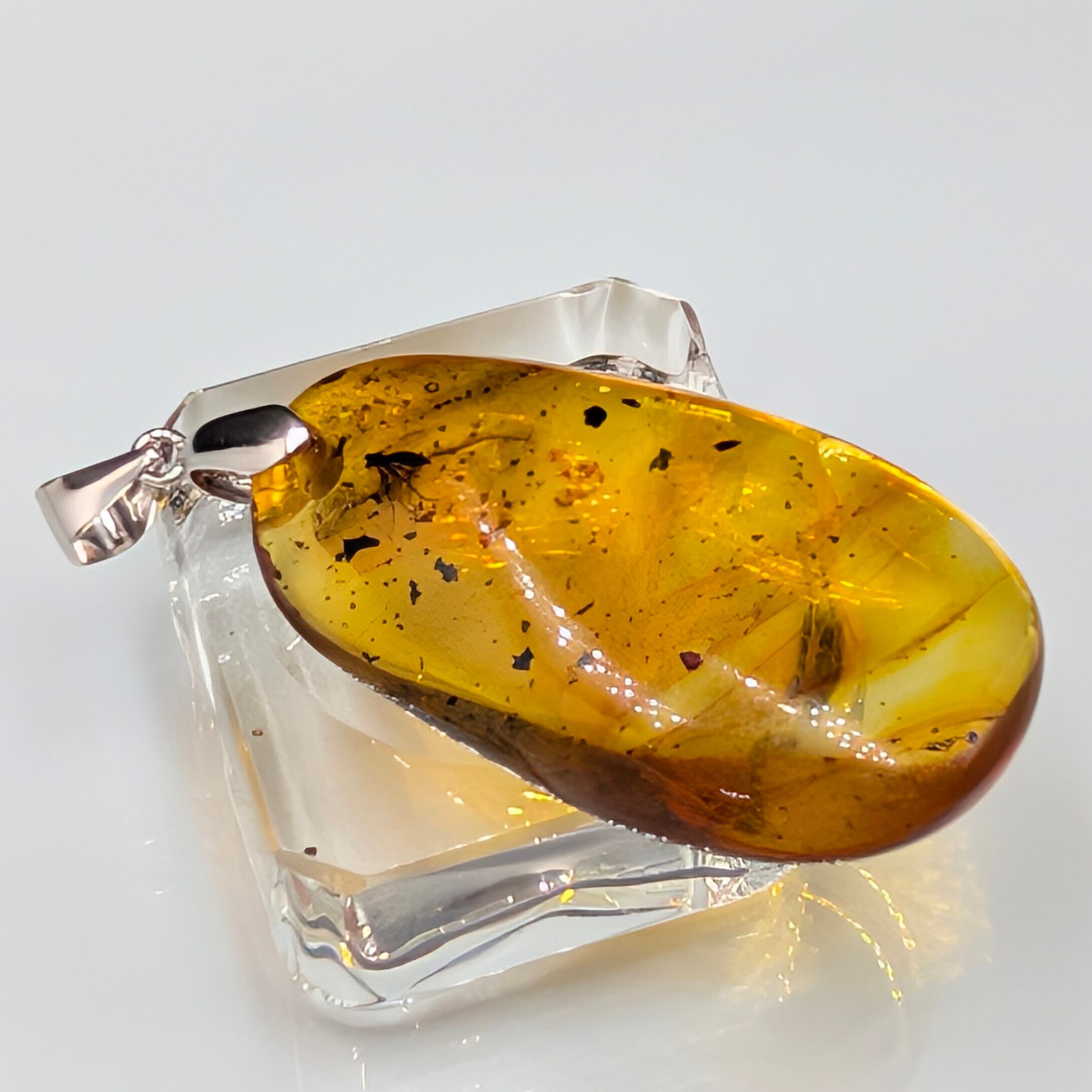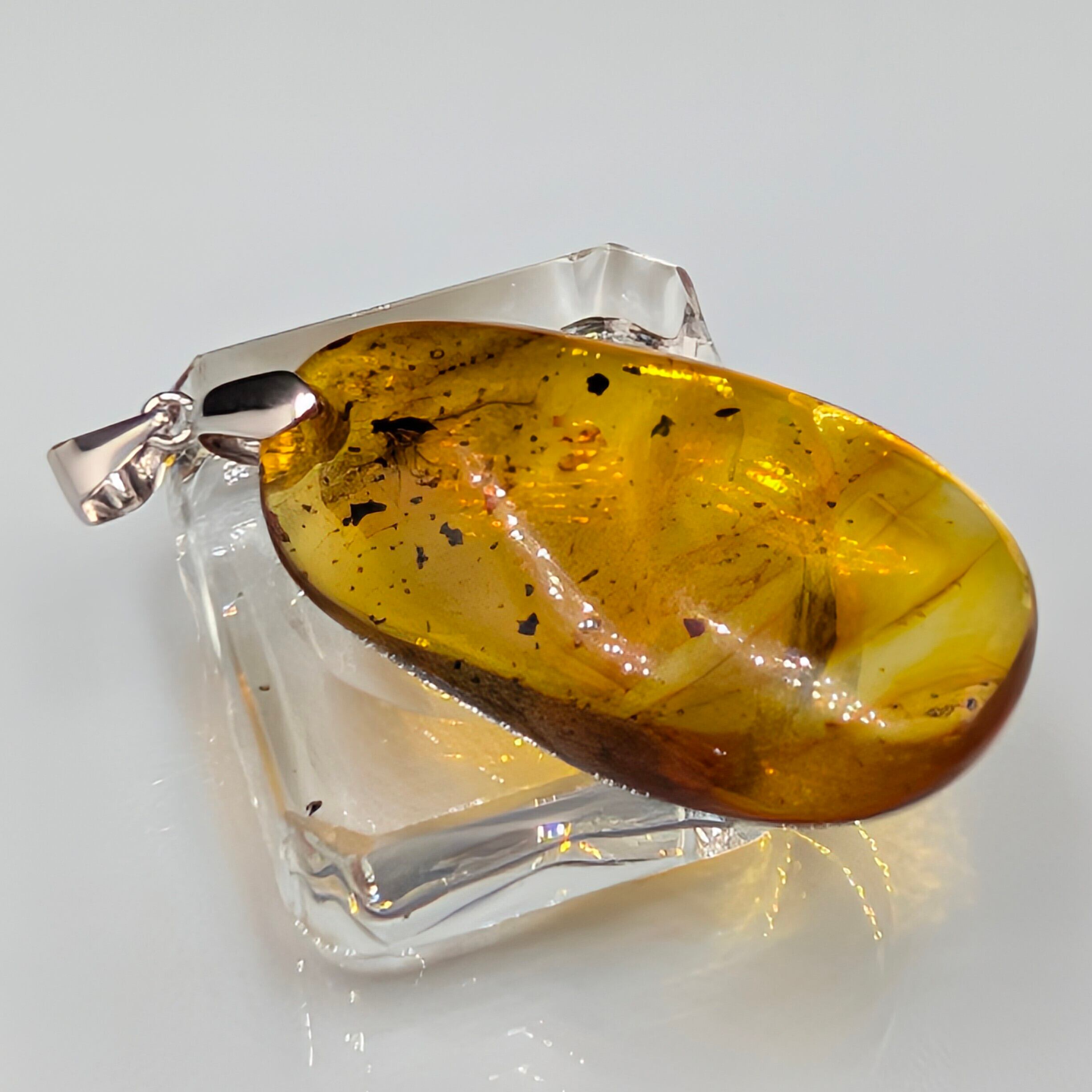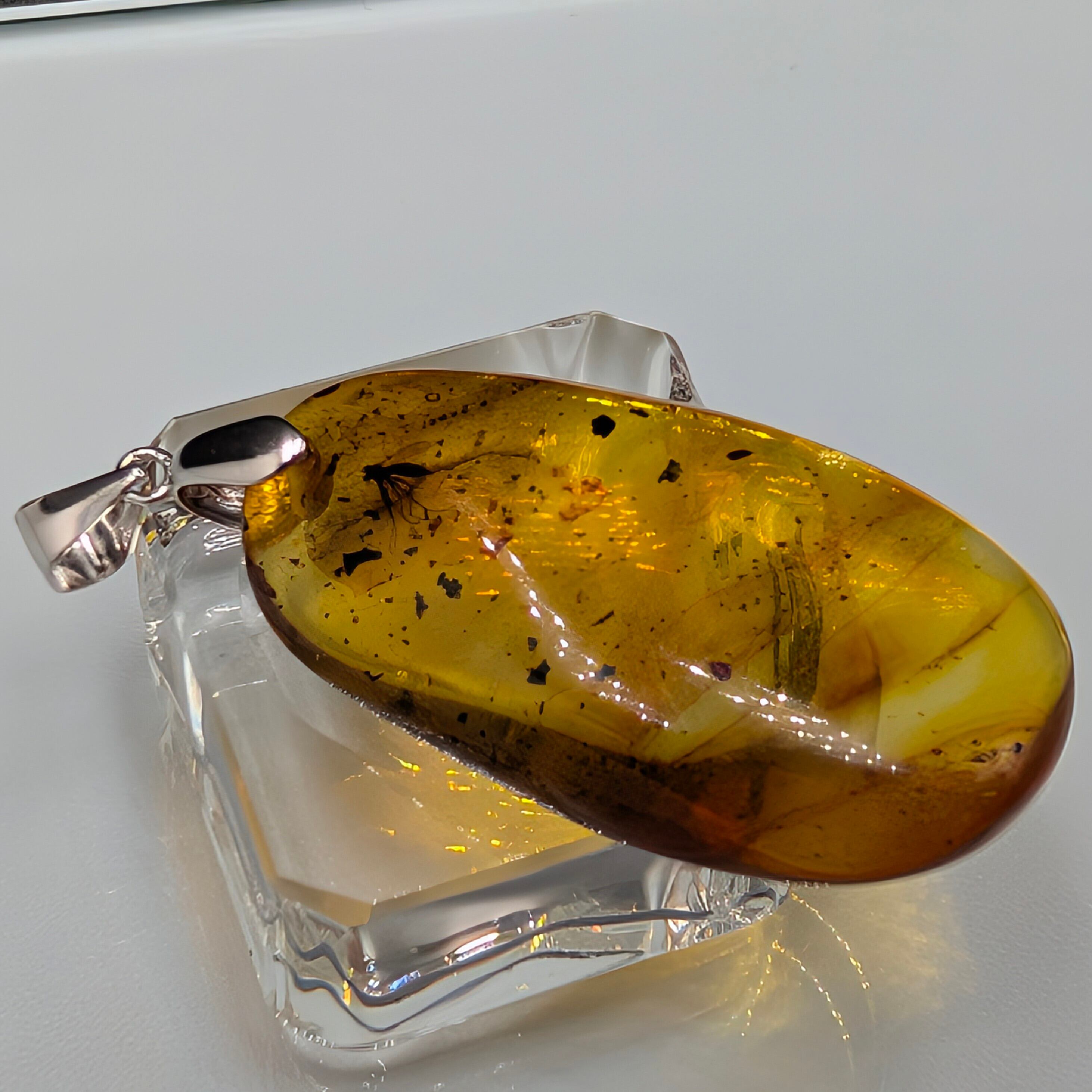 とろけるような甘い蜜色(ハニーカラー)の内部には、太古の空気が気泡となり、光を反射してキラキラと輝きます。柔らかなリーフ型のフォルムが、シルバー925の繊細な台座と相まって、大人の女性の胸元を上品かつ華やかに彩ります。
