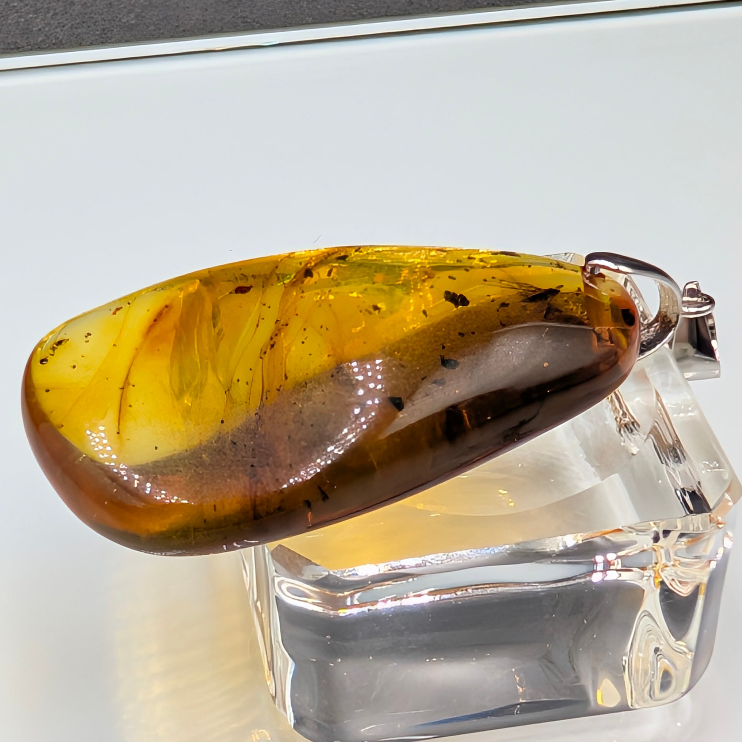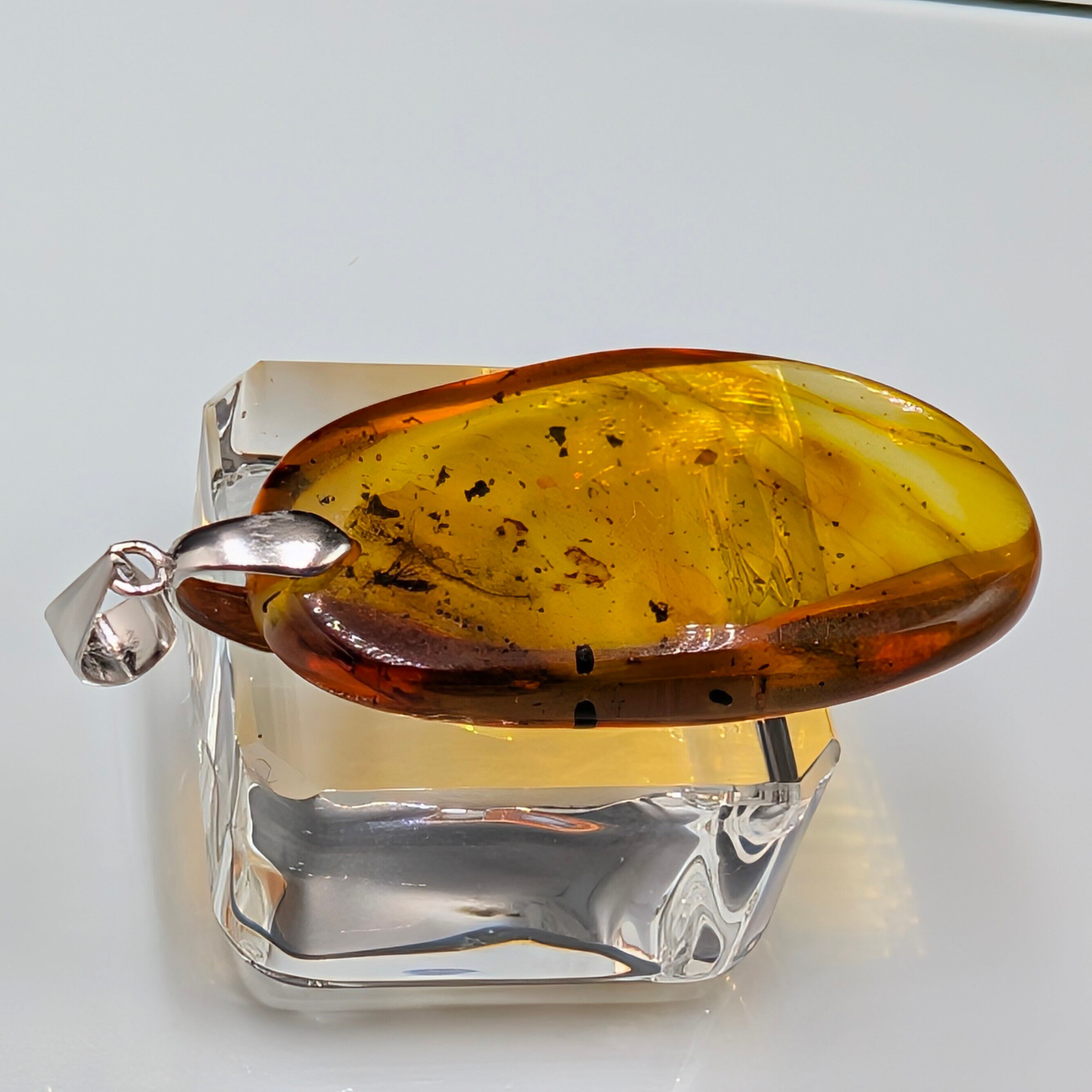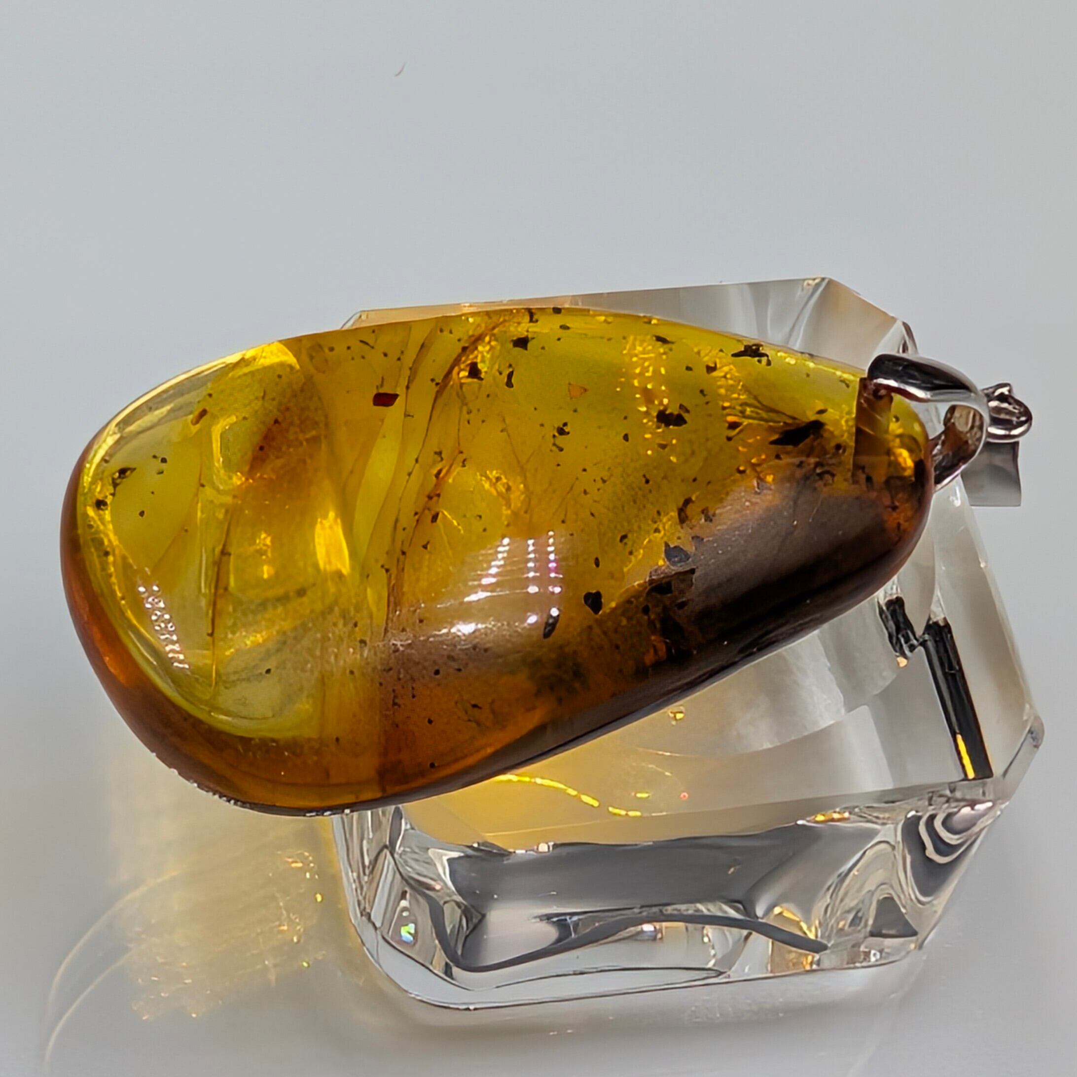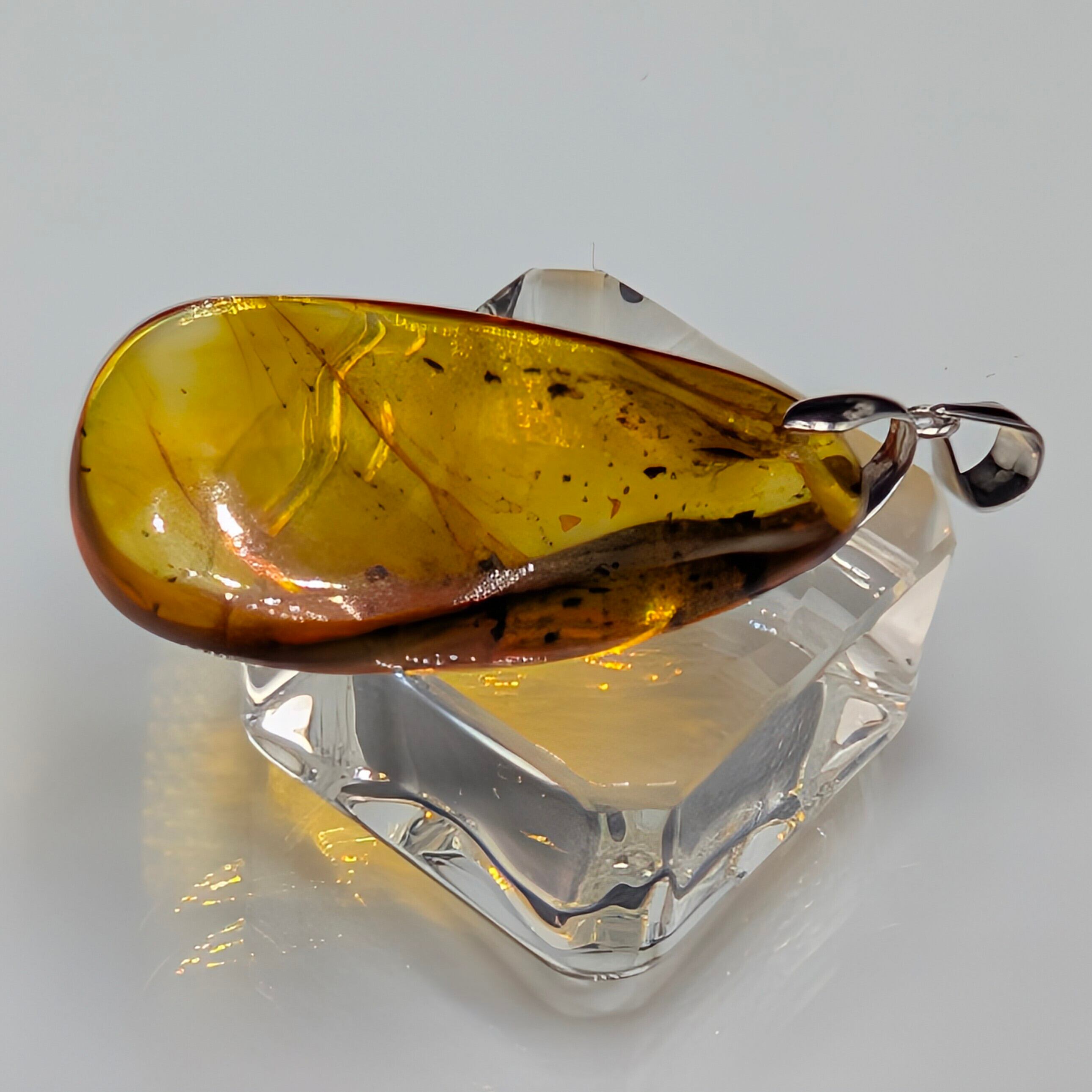 とろけるような甘い蜜色(ハニーカラー)の内部には、太古の空気が気泡となり、光を反射してキラキラと輝きます。柔らかなリーフ型のフォルムが、シルバー925の繊細な台座と相まって、大人の女性の胸元を上品かつ華やかに彩ります。